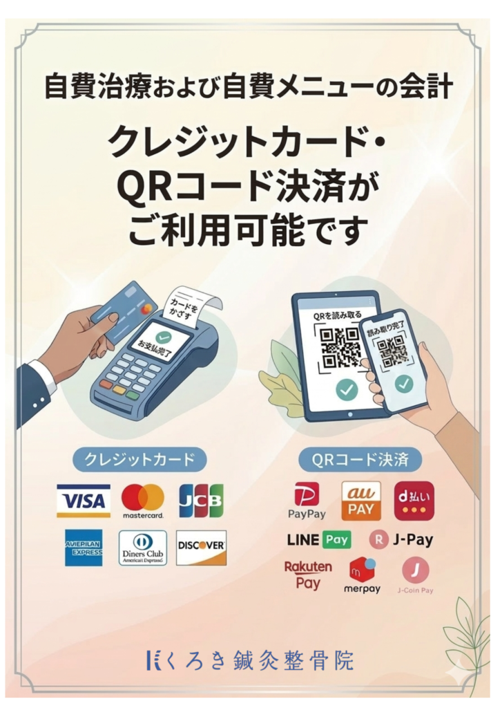 自費施術や自費施術メニュー(骨盤矯正や鍼灸など)をお受けの方は、クレジットカードや各種QR決済でのお支払いが可能です。 ※保険施術分のみ、お支払いは現金でお願いしております。